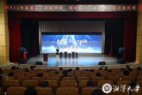 与会领导嘉宾共同触摸屏幕按钮,正式启动“2022年雨湖区科技活动周”。