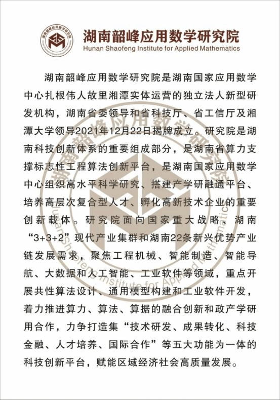 湖南航天天麓新材料检测有限责任公司与湖南韶峰应用数学研究院有力整合双方智力、技术和产业链资源,联合申报新一代人工智能开放创新平台,共同致力于持续输出基于工业人工智能检测的核心研发能力和服务能力,推动人工智能检测领域相关基础理论、关键核心技术、软硬件支撑体系和产品应用的发展,形成具有全国影响力和广泛覆盖面的人工智能检测创新成果。双方后续将基于平台项目建设,在基础理论、模型方法、基础软件研究、成果转化应用、开放共享服务等领域开展广泛的合作。