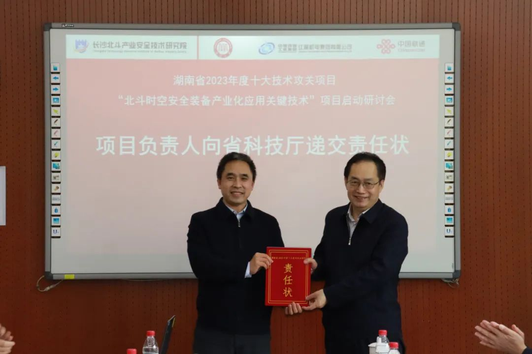 王先民处长宣读了十大技术攻关项目立项文件,并由项目负责人、长沙北斗研究院执行院长明德祥向省科技厅递交责任状。