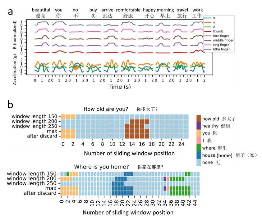 此外,该成果收集了48个日常生活中常用的汉语手语单词的样本用于训练CNN模型,预训练的CNN模型对于孤立手语单词的识别准确率达到95.85%(图2a)。针于手语句子的识别,该成果提出了一种融合多滑动窗口,并使用相关性分析结合CNN来提高正确率的方法,该方法可在不需要对句子样本进行额外训练的情况下实现手语句子的识别,识别的正确率可高达84%(图2b)。与以往的可穿戴手语识别系统相比,该方法在句子识别方面更具优势,对训练数据集之外的新句子有更好的扩展性。论文得到国家重点研发计划的资助。