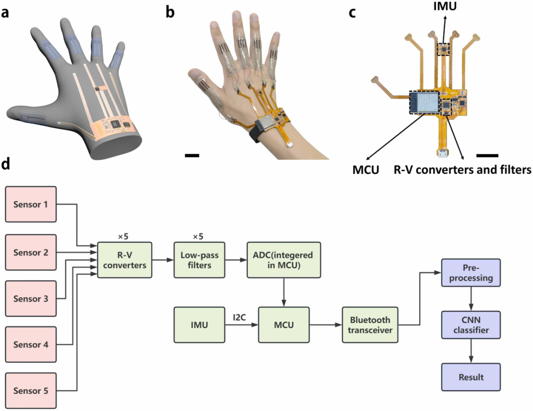 新型可穿戴设备在各种应用领域中受到了广泛关注,如人体运动监测,医疗监测,和人机交互等等。其中,可穿戴手语识别设备是一重要的新兴研究方向,其对于消除手语使用人群和非手语使用人群之间的交流障碍具有重要意义。由于手语是一种结构复杂的语言,涉及连续和动态的各种手势,因此实现高鲁棒性的手语识别是一个巨大的挑战。针对这一挑战,该团队提出了一种由卷积神经网络(CNN)实现的可穿戴手语识别系统,该系统集成了可拉伸应变传感器和惯性测量单元,以感知手的姿势和运动轨迹(图1)。该成果中提出的可拉伸应变传感器十分轻薄,可直接贴附于人体表面,具有良好的线性度(R2>0.998)、足够的灵敏度(GF=4)、快速响应时间(小于200 ms)、良好的稳定性和高耐久性。