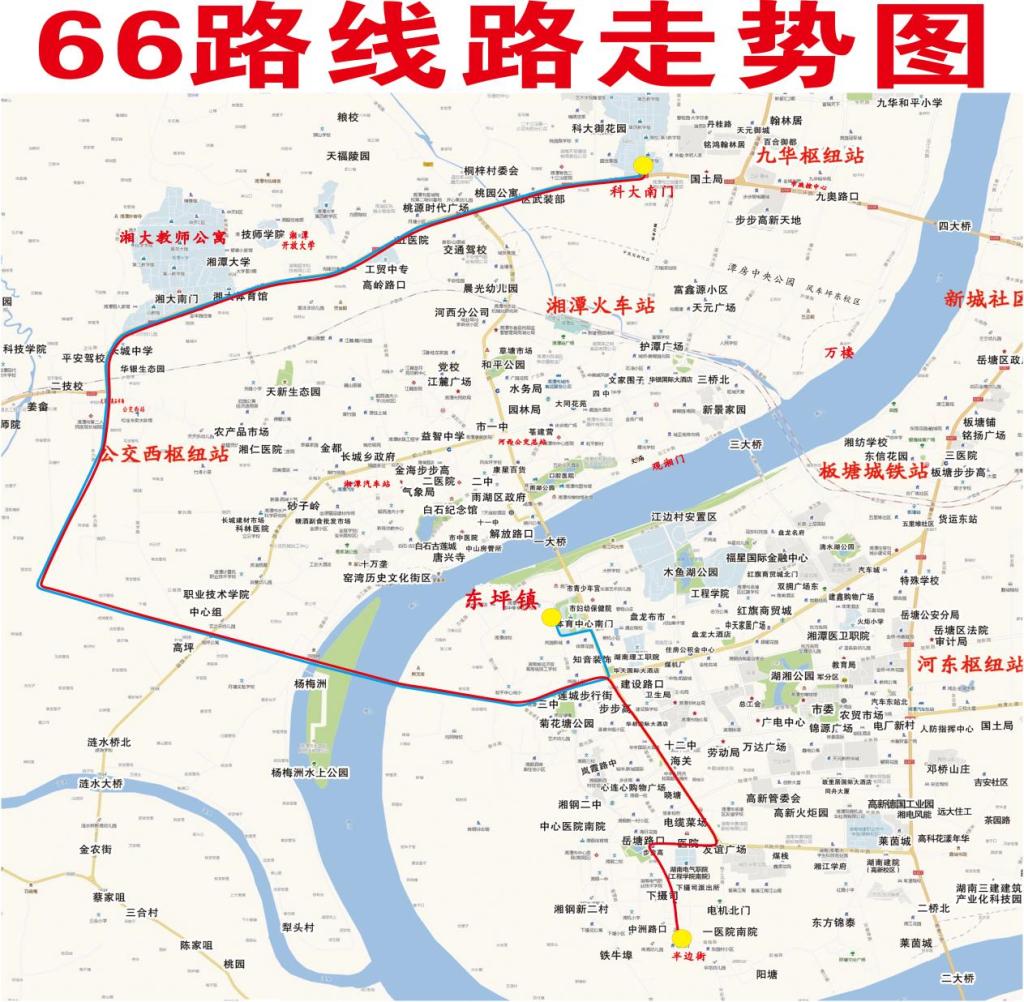 优化后的路线:从半边街站途经下摄司街(中州路口→下摄司→下摄司派出所→湖南电气职院)、书院西路(斑竹塘→一医院)、建设南路(友谊广场→电缆菜场→晓塘→天鹤村→华都国际大酒店→莲城步行街→建设路口)、河东大道辅路原线到达科大南门站,新增站点14个。原线路4个站点,可由高新1路、高新2路、盘龙大观园河东专线覆盖到达。