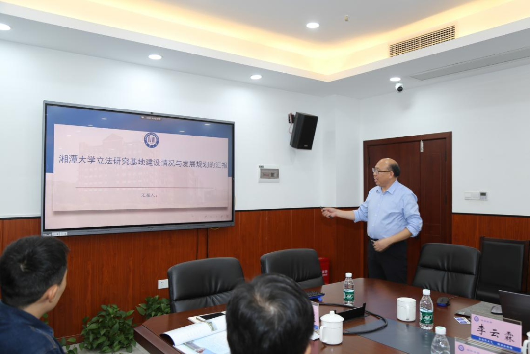 李云霖汇报了立法研究基地建设情况和发展计划,指出立法研究基地积极配合省人大常委会的立法工作安排,开展立法起草、立法咨询、立法调研、立法研究等活动,为有关法律法规规章和规范性文件的出台贡献湘大智慧。