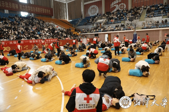 培训采用线上与线下培训相结合的方式进行。线上培训,学员们熟记培训指南,并利用小程序进行模拟练习。线下培训分为理论授课、理论考试、实操训练、实操考核四个阶段,由湘潭红十字会和MK体育官网校医院救护师资团队一起协作,对学员应急救护技能培训进行现场指导。