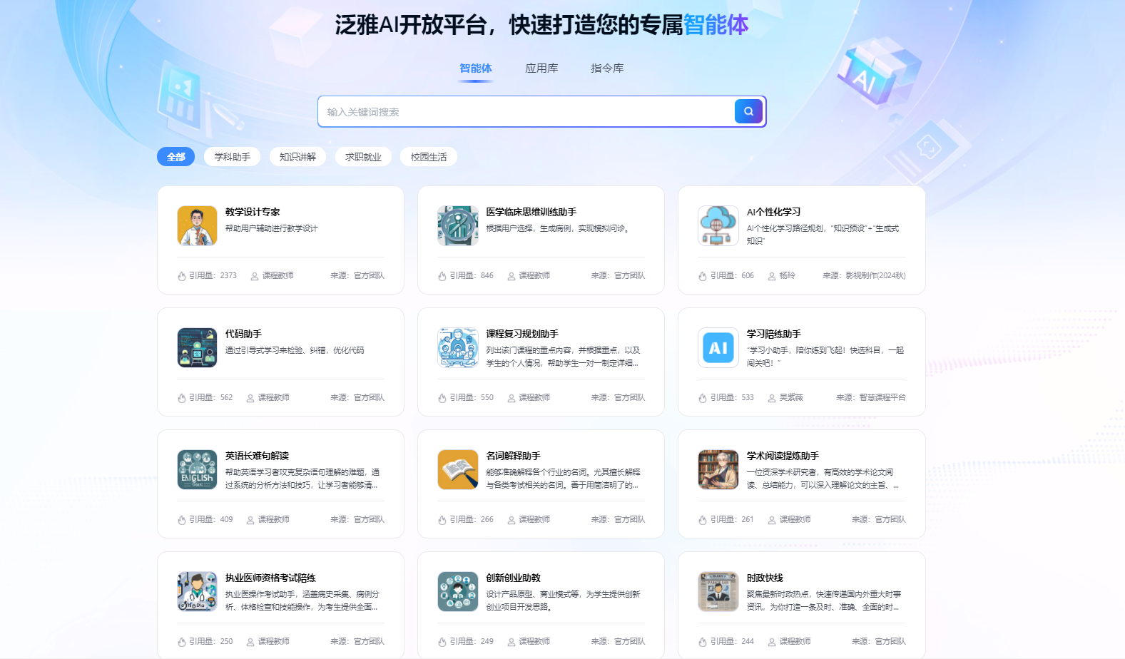 为更好的协助老师升级智慧课程,超星智慧课程平台开放并搭建了专属泛雅AI开放平台,为老师进行学科智能体的搭建。既帮助老师快速搭建学科智能体,又能自行搭建个性化智能体。