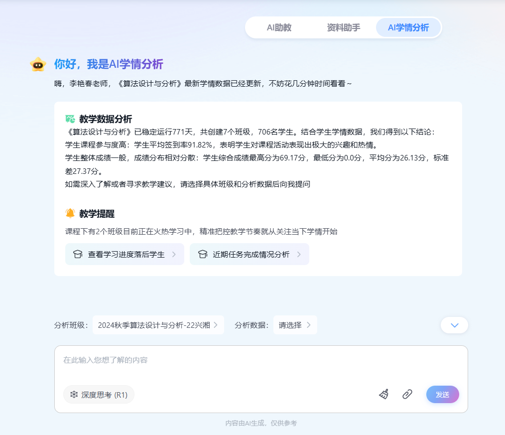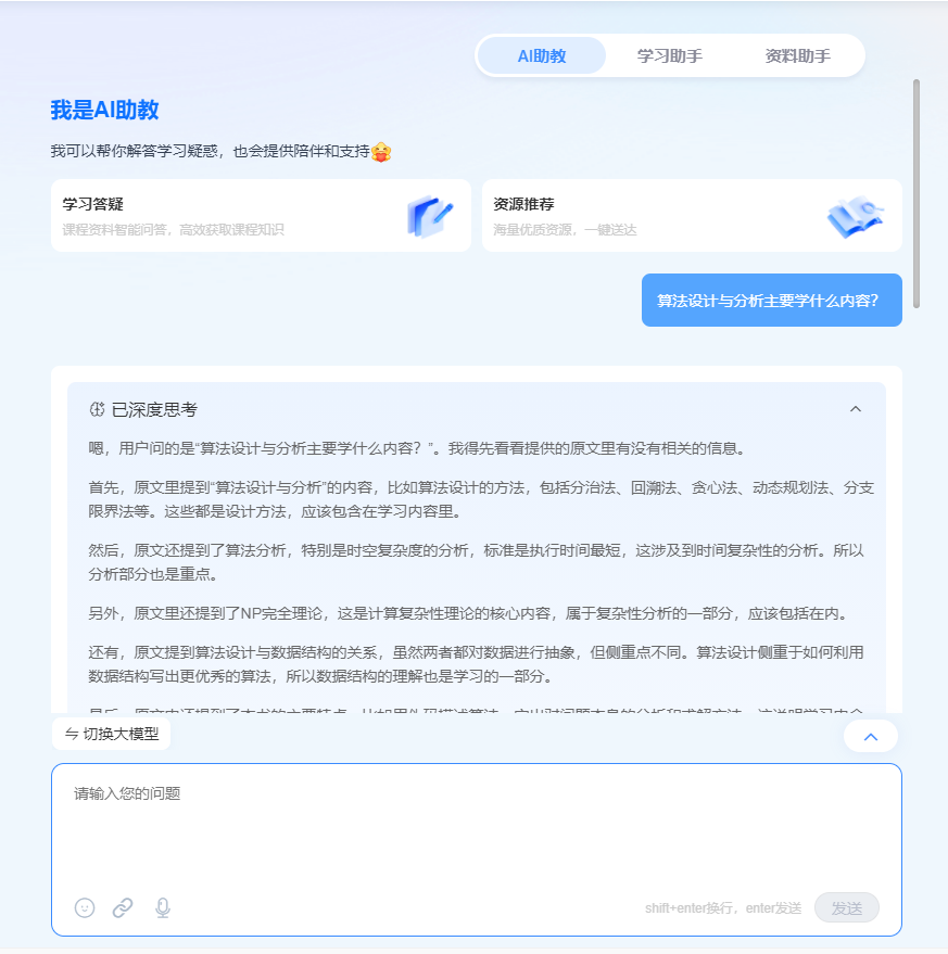 AI助教是深度融合课程特色的智能教学伙伴,其核心能力来自与课程同步的专属知识库,像课程的数字化“大脑”,能精准解析教学大纲、课件和学科逻辑。针对课程高频问题,教师可预置问答对库,它靠语义理解定向匹配知识点,大大提升答疑准确率。