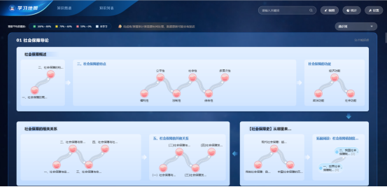 依托超星自主研发的多元图谱引擎,将离散知识点转化为三维知识网络。每门课程构建专属知识点关联模型,通过动态路径算法为每位学生生成专属学习路径,实现从"填鸭式学习"到"体系化建构"的质变。