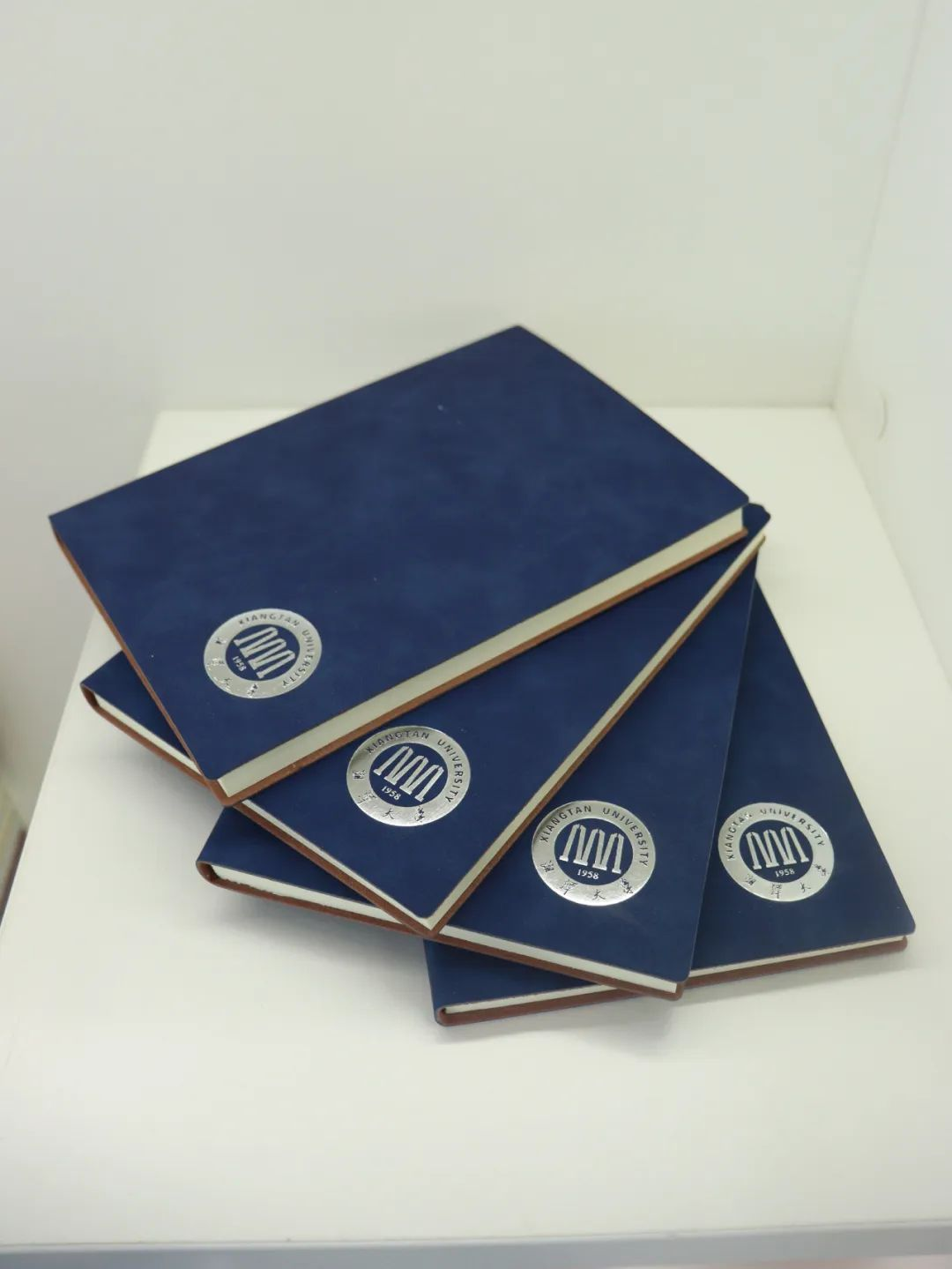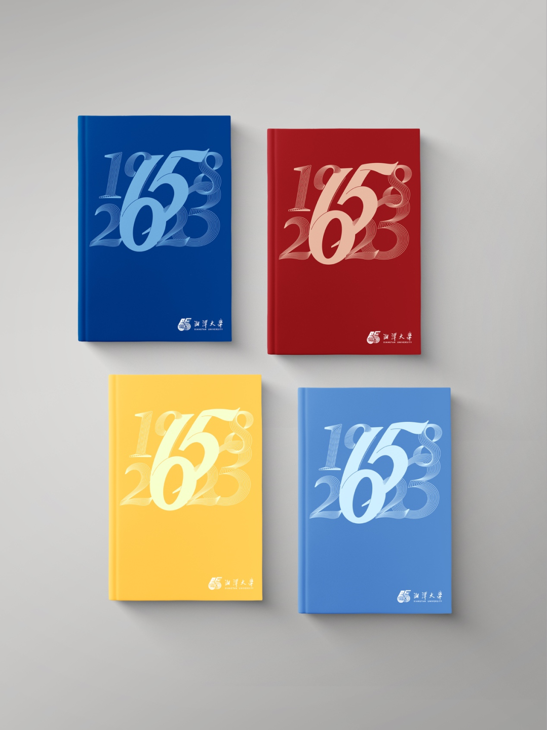 笔记本封面使用1958年、2023年两个年份数字进行融合变形,配以湘水蓝、韶峰红、琥珀黄、宝石蓝四色,热情活泼,青春洋溢。