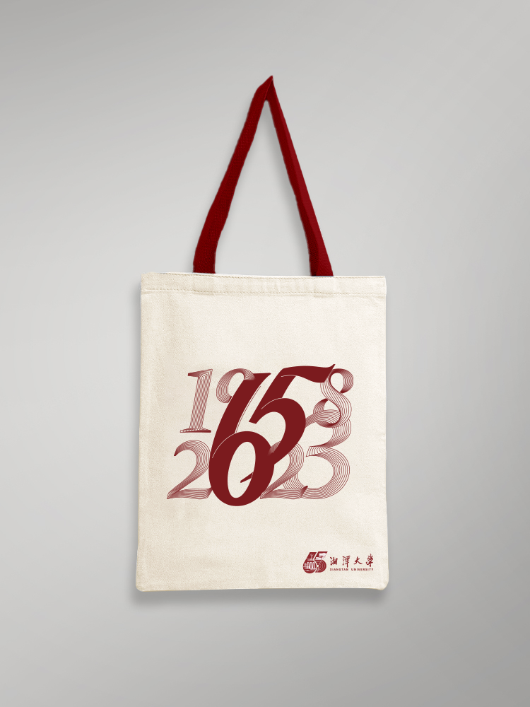 袋身图案使用1958年、2023年两个年份数字进行融合变形,手提带配以韶峰红、湘水蓝做配色,简约时尚。