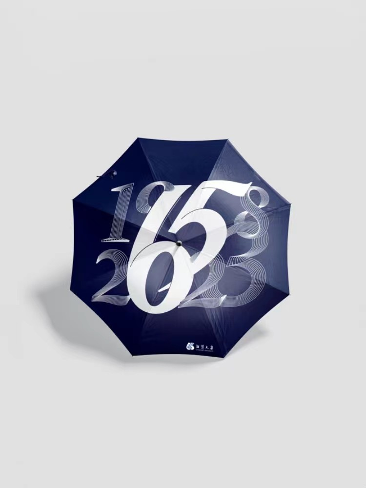 伞面图案使用1958年、2023年两个年份数字进行融合变形,整体使用蓝白配色,简洁大方。
