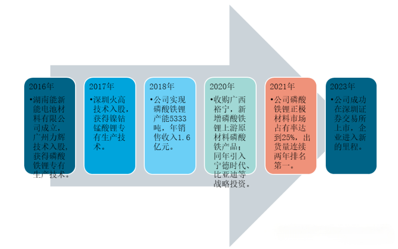 湖南裕能专注于锂离子电池正极材料的研发、生产和销售,主要产品包括磷酸铁锂、三元材料等,目前以磷酸铁锂为主,广泛应用于动力电池、储能电池等锂离子电池制造,最终服务于新能源汽车、储能等热门领域。自2016年6月成立以来,公司通过一系列战略举措不断发展壮大。成立初期,吸引广州力辉入股,成功获得磷酸铁锂专业生产技术;2017年,深圳火高技术的加入,又为公司带来了镍钴锰酸锂专有生产技术,为公司产品多元化发展奠定了基础。